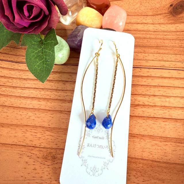 深い群青のラピスラズリと、優美な曲線を描くメタルのウェーブパーツが揺れるエレガントなピアスです。 動くたびに異なる表情を見せるラピスラズリが、知的で洗練された印象を演出します。 メタルパーツの繊細な輝きが上品さを引き立て、耳元に華やかさを持たせてくれます。 軽やかなつけ心地で、長時間のご使用でも負担になりにくいのも魅力です。 シンプルながらも存在感のある、大人の女性にふさわしいピアスです。 【ラピスラズリの石の意味】 真実を見抜くと言われる第三の目を開かせ、直感力や判断力を高めることで、思い描いていた願いを実現へ導くと伝えられるといわれています。 【ラピスラズリの大きさ】 縦1cm・横5mm チェーンの長さ:4cm 【メタルパーツ】 6cm 【重さ】 2g ラピスラズリとメタルパーツがゆらゆらと揺れてとても上品に見えるピアスです。 ☆商品について ハンドメイド品のため、作品ごとに多少の差異が出がます。 繊細な作りとなっておりますので、無理な力や圧を加えますと破損するおそれがありますのでご注意下さい。 写真の写りによって実際のお色味と多少違いが出る場合があります。