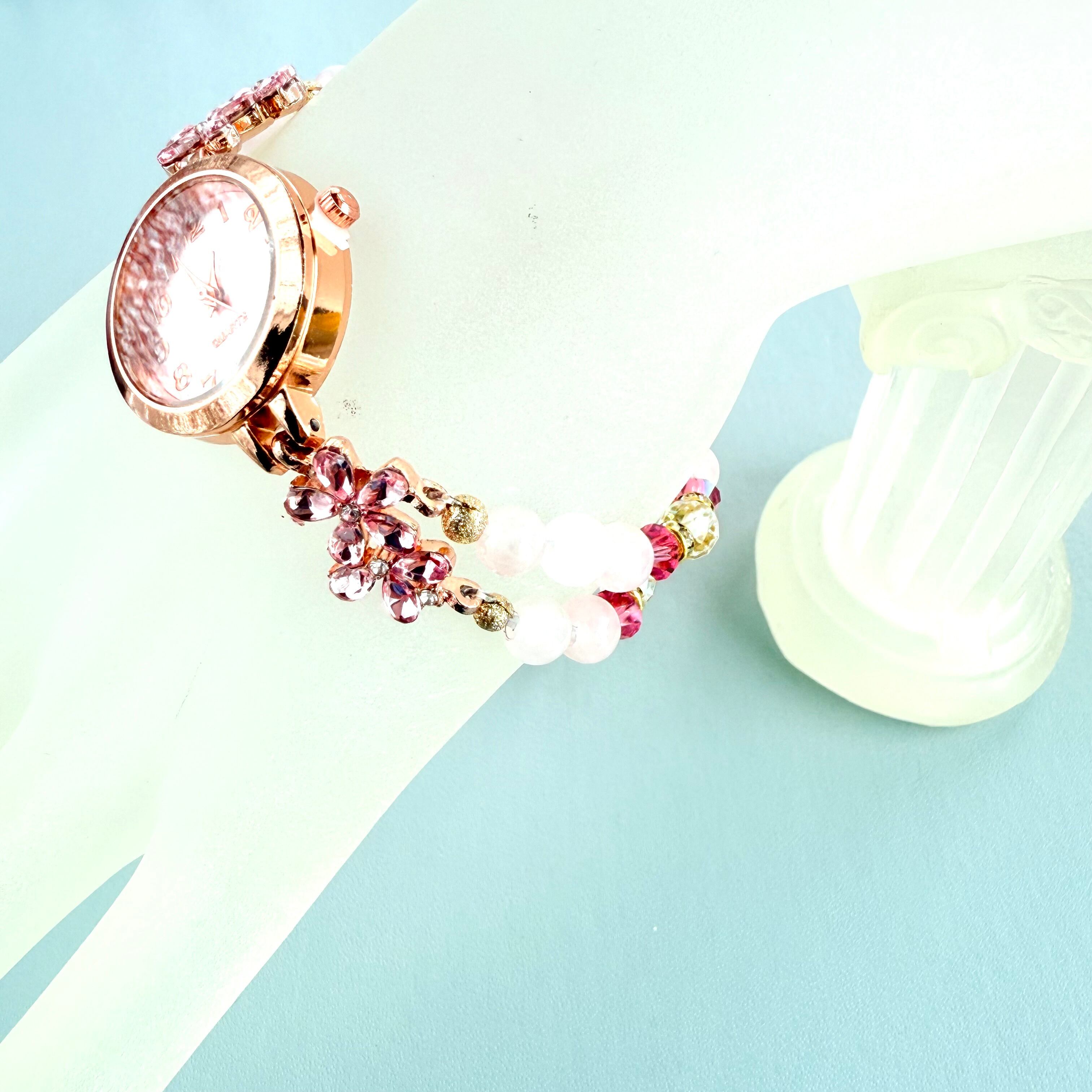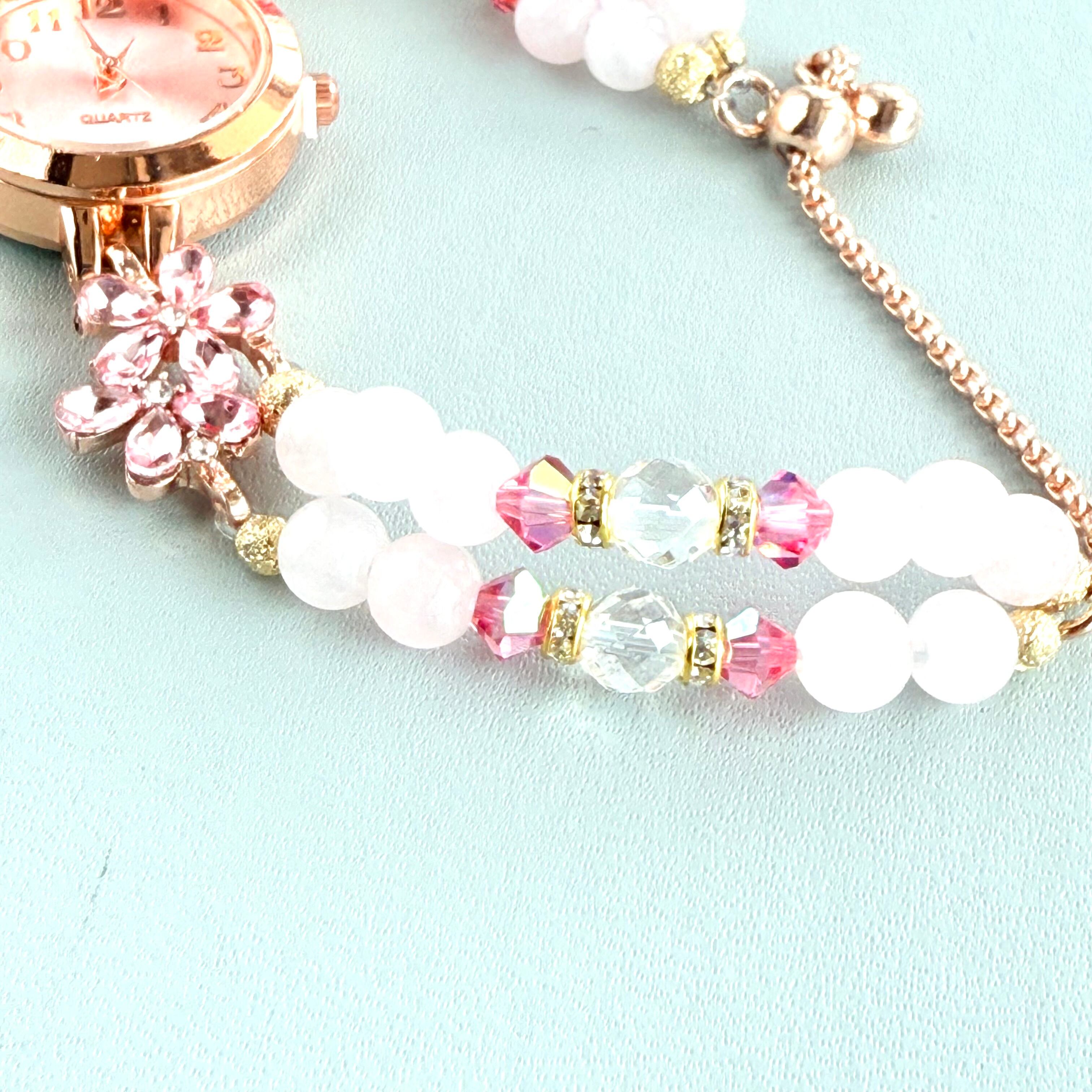 やさしいピンクの天然石と華やかな輝きが手元を彩る、アクセサリー感覚の腕時計です。