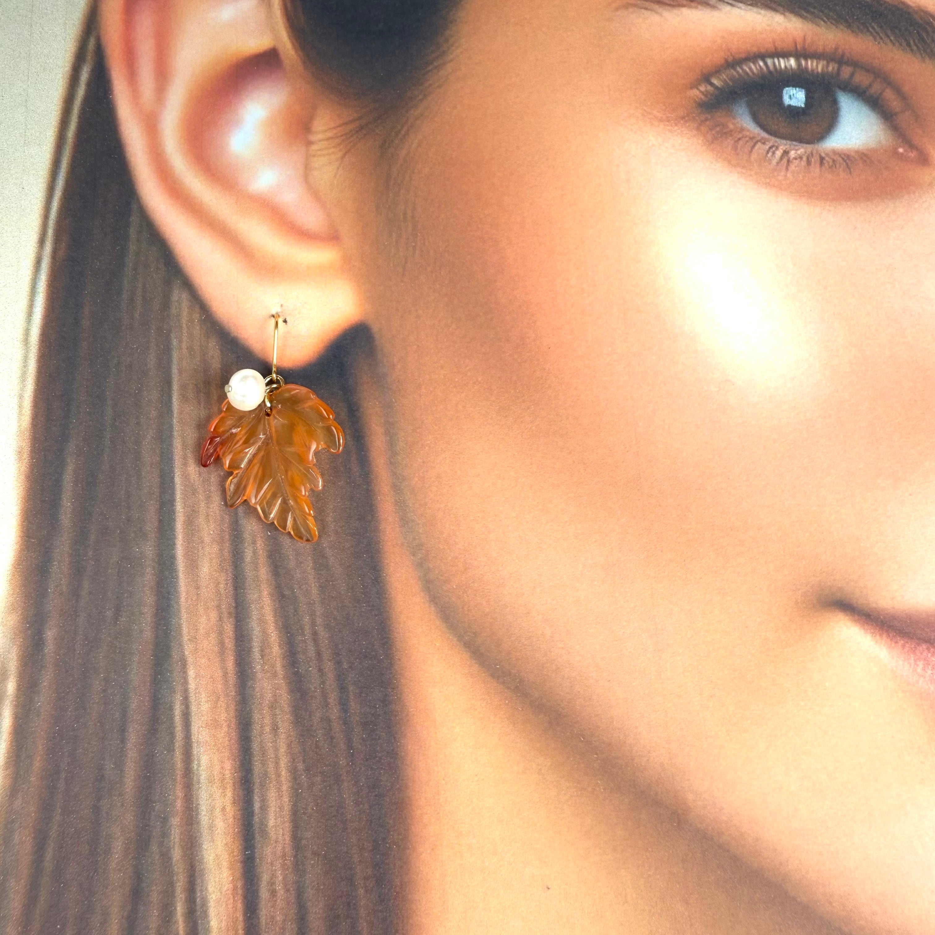 温もりのあるオレンジ色が魅力のカーネリアンのリーフ型ピアスです。