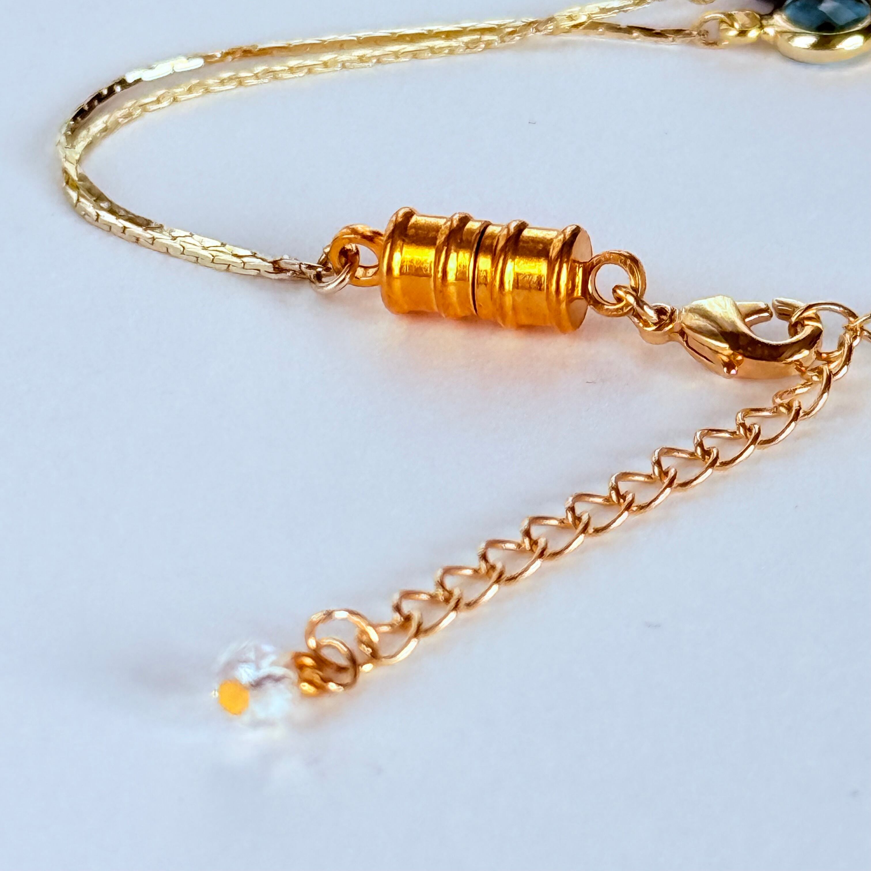 石が並ぶチェーンを少し長めにすることで、腕に馴染みながらも動きのある優雅なデザインに仕上げました。