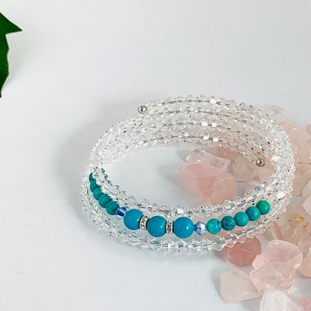 光の角度によって輝きを変えるガラスビーズが、ターコイズの色彩を一層引き立て、手元に華やかさと上品さをプラスします。