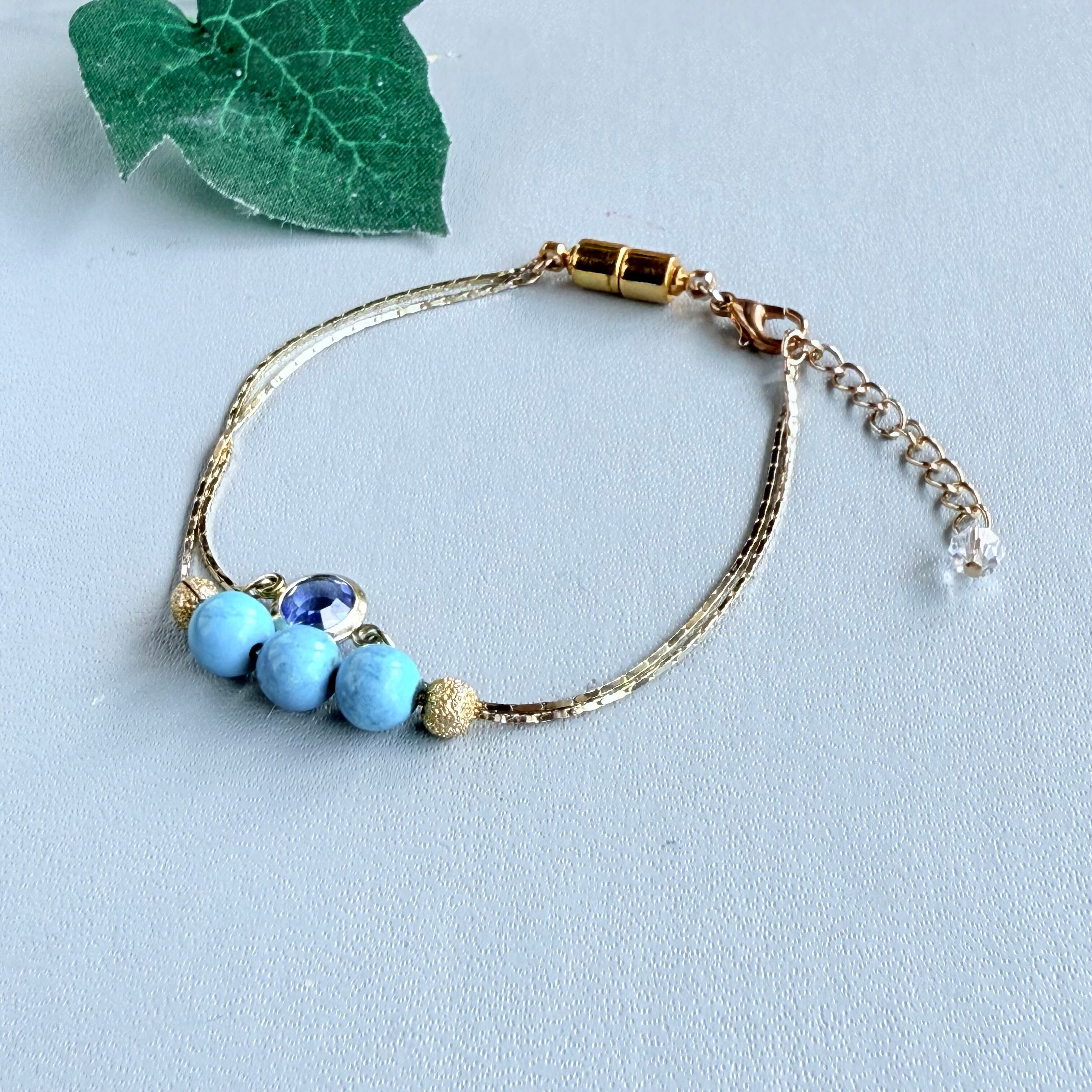 ターコイズの爽やかなブルーと、同系色のガラスパーツが調和し、手元を華やかに彩ります。