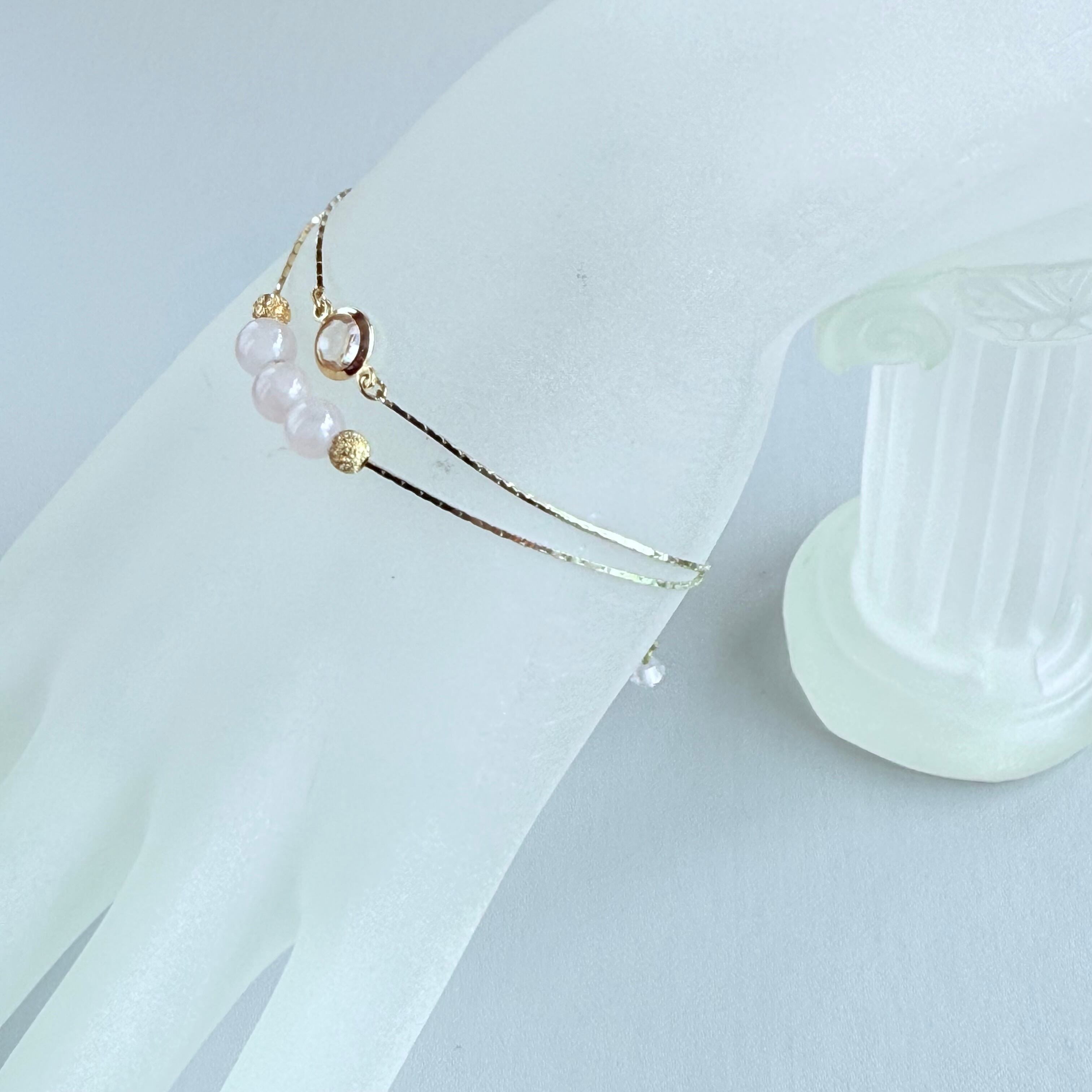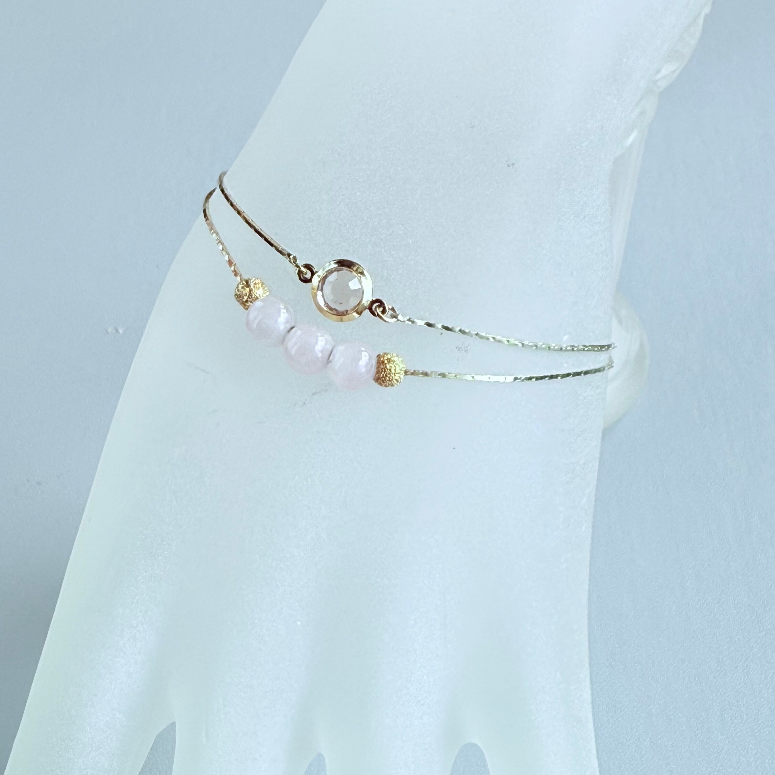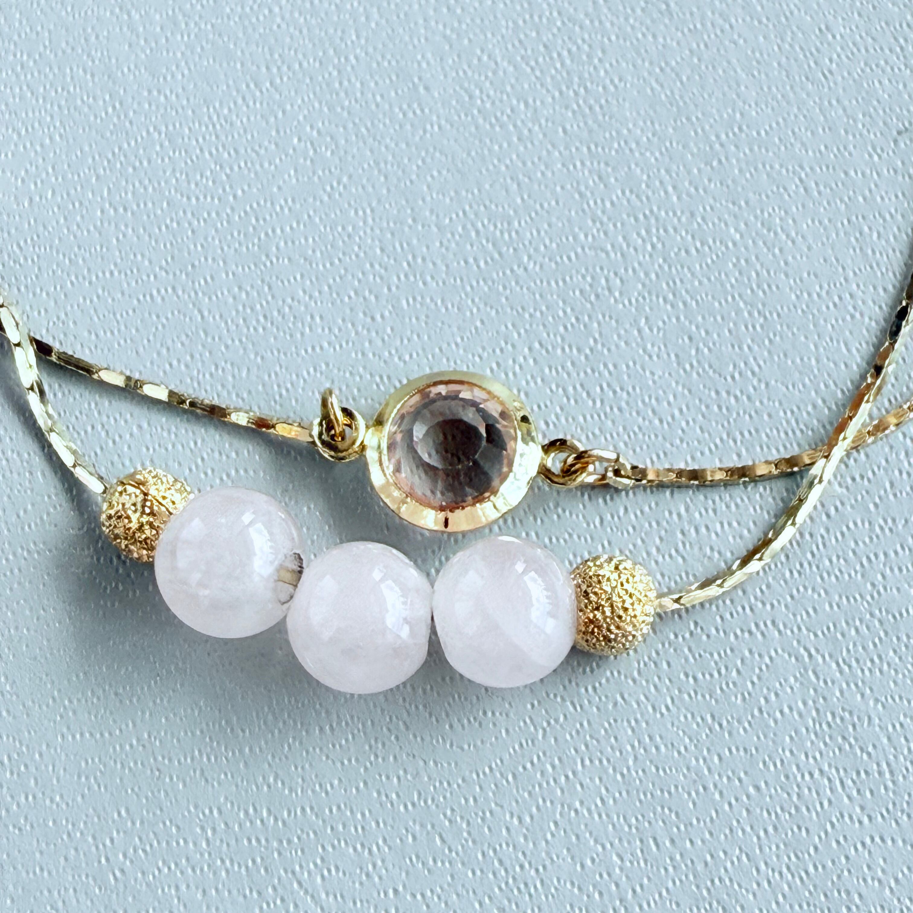 繊細なゴールドチェーンと優しいピンクのローズクォーツが織りなす、可憐で上品な2連ブレスレットです。