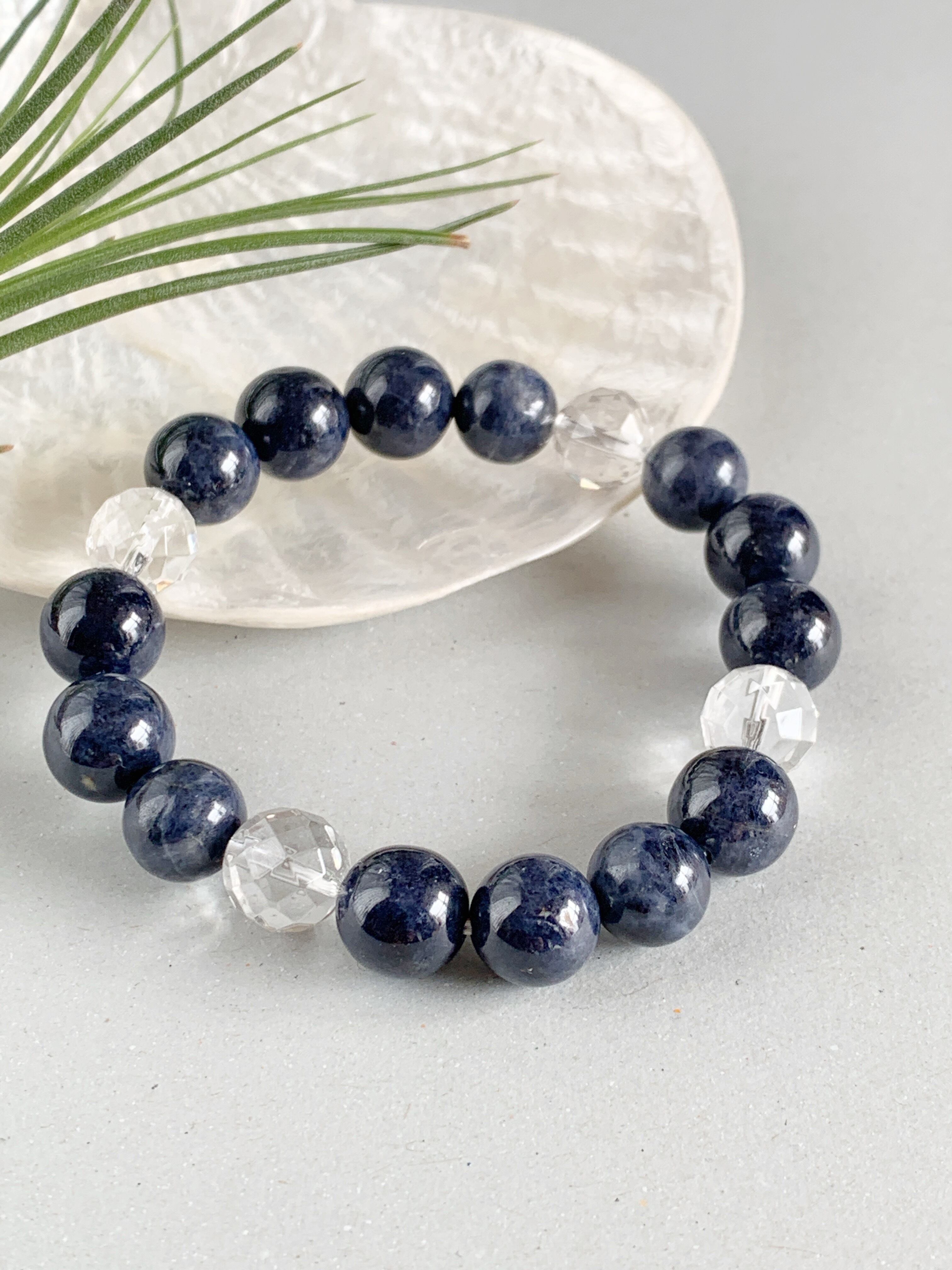 深みのある美しいサファイアと、透明感あふれる水晶を組み合わせた、上品なブレスレットです。